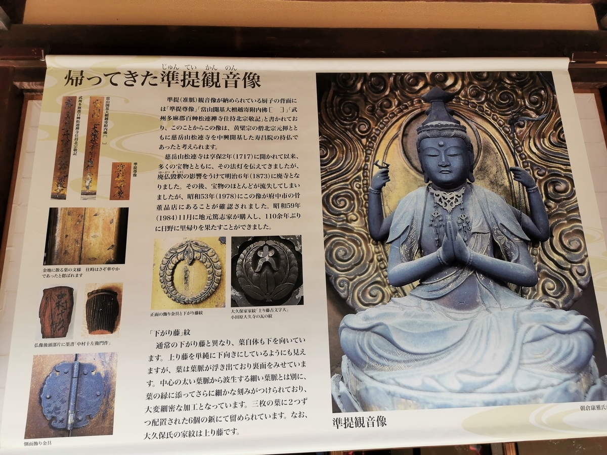 2024-02-12 百草園で准胝尊に出会う 自宅からそれほど遠くない「百草園」。 この季節は梅が鑑賞できると、妻に無理やり連出されたが、そこで思わぬ形で准胝さまに触れる。 解説には黄檗宗の名前がある。 これは、宋以降の禅密双修で密教では中心的に拝まれた准胝尊だから。黄檗宗と一緒に、准胝尊は日本に再輸入されたからと思う。 見た目は四臂しかないので欠損しているのだと思うが、胸前の合掌は間違いかな。でもとてもつくりの良いお像ですね。実物を拝見したいと思いました。